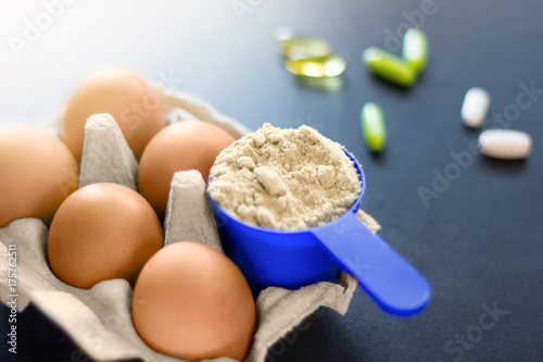 Sources Of Protein Tray Of Eggs With Whey Protein Powder In Blue Plastic Scoop Pills On Dark Background Buy This Stock Photo And Explore Similar Images At Adobe Stock Adobe Stock