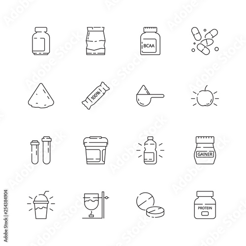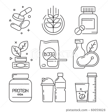 Vector Art Sport Medication Icons Whey Multivitamin Pills Drinks Supplement Dietary Fitness Food Vector Linear Symbols Clipart Drawing Gg Gograph