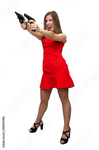 The Spy Special Agent Girl Secret Service Dangerous Sexy Woman In Red Dress In Stockings And High Heels Shoes Is Holding Gun In Her Hands Isolated On White Buy This Stock