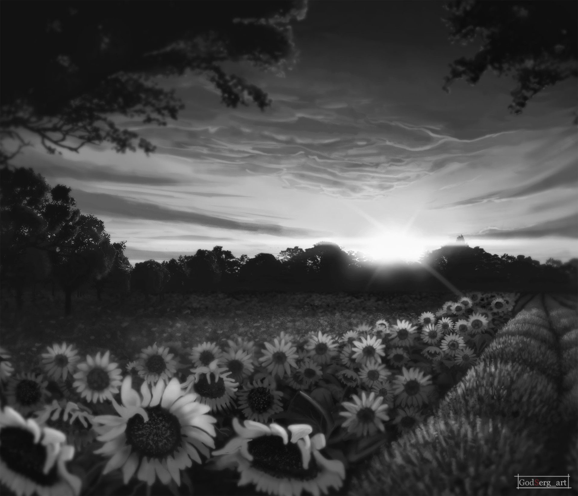 Godserg Art Sun Flowers On A Sun Rise Grey Scale