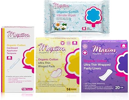 Amazon Com Maxim Organic Cotton Tampons With Applicator Contour Maxi Pad With Wings Panty Liners And Feminine Wipes Combo Pack Chlorine Dioxin Chemical Free 4 Pack 70 Count Health Personal Care