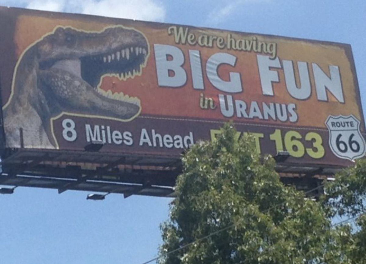 Uranus Missouri Big Fun On Historic Route 66 Sign With Dinosaur That Mimics The Iconic Uranus Billboard On Interstate 44