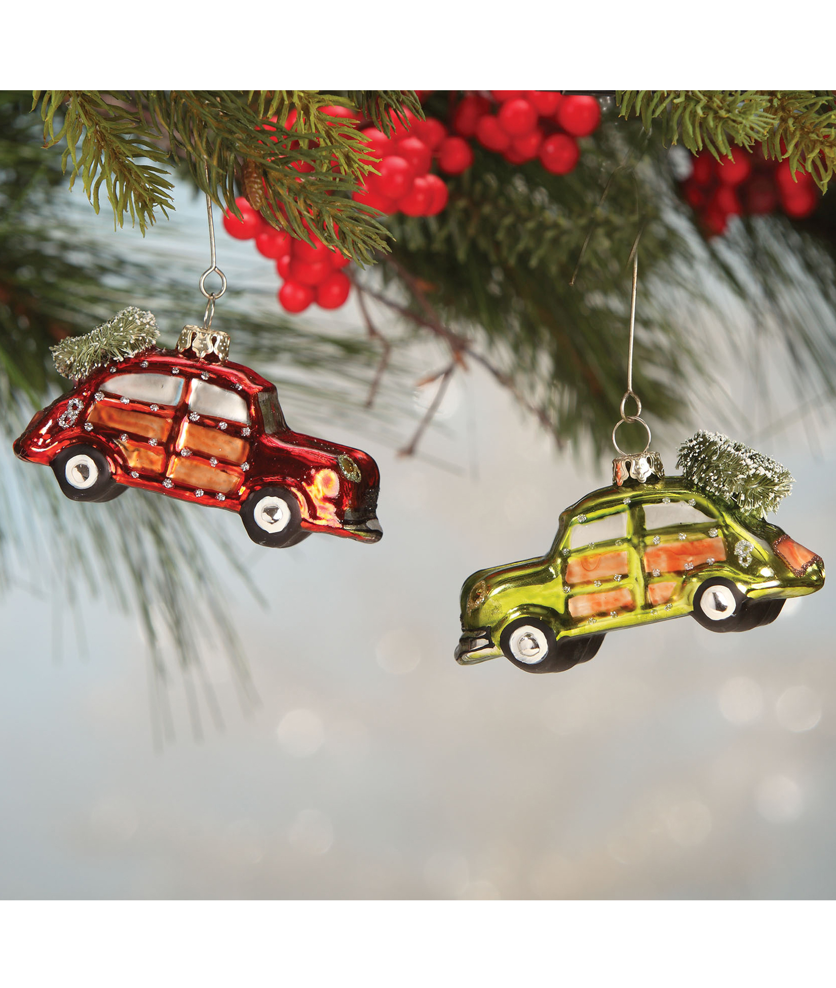 Woody Station Wagon With Tree Blown Glass Christmas Ornament Outdoorwood