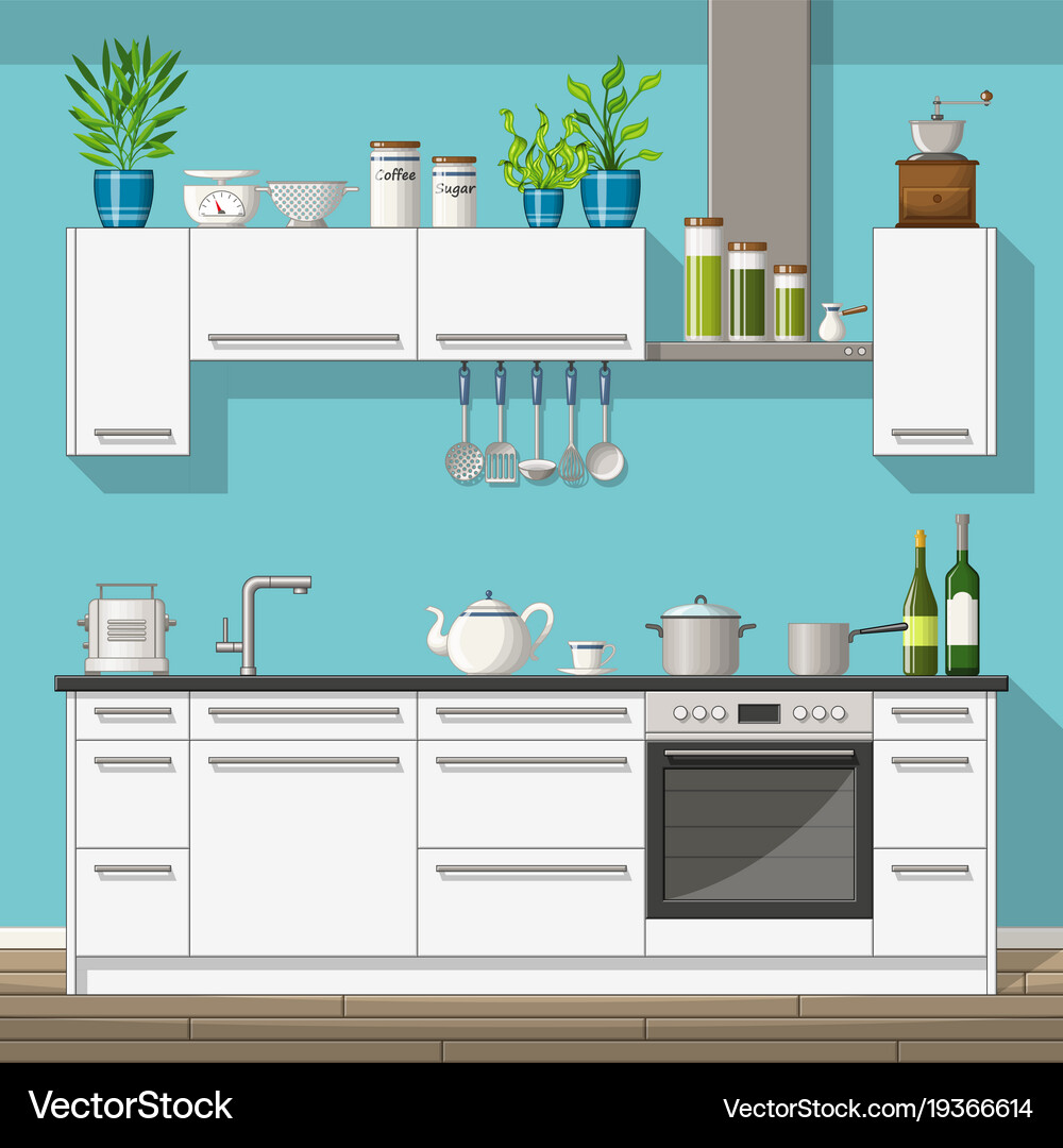 Flat Vector Kitchen With Cooking Tools Equipment And Furniture Stock Vector C Mssa