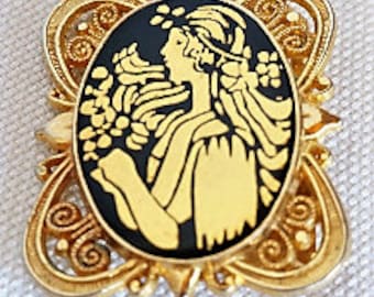 Vintage Antique Black Cameo Brooch Pin Carved Girl Silhouette Face Flowers Beads