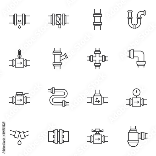Plumbing Line Icons Set Linear Style Symbols Collection Outline Signs Pack Vector Graphics Set Includes Icons As Water Pipes Connections Pipeline Gauge Pressure Meter Broken Pipe Repair Buy This Stock Vector