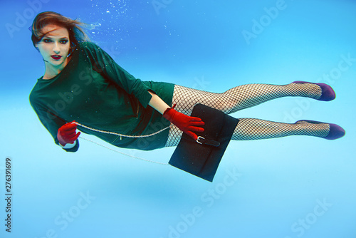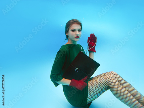 Beautiful Amazing Stylish Pretty Young Woman In Green Dress Red Gloves Black Clutch Bag And Tights In The Net Underwater In The Swimming Pool Fashion And Shopping Concept Buy This Stock