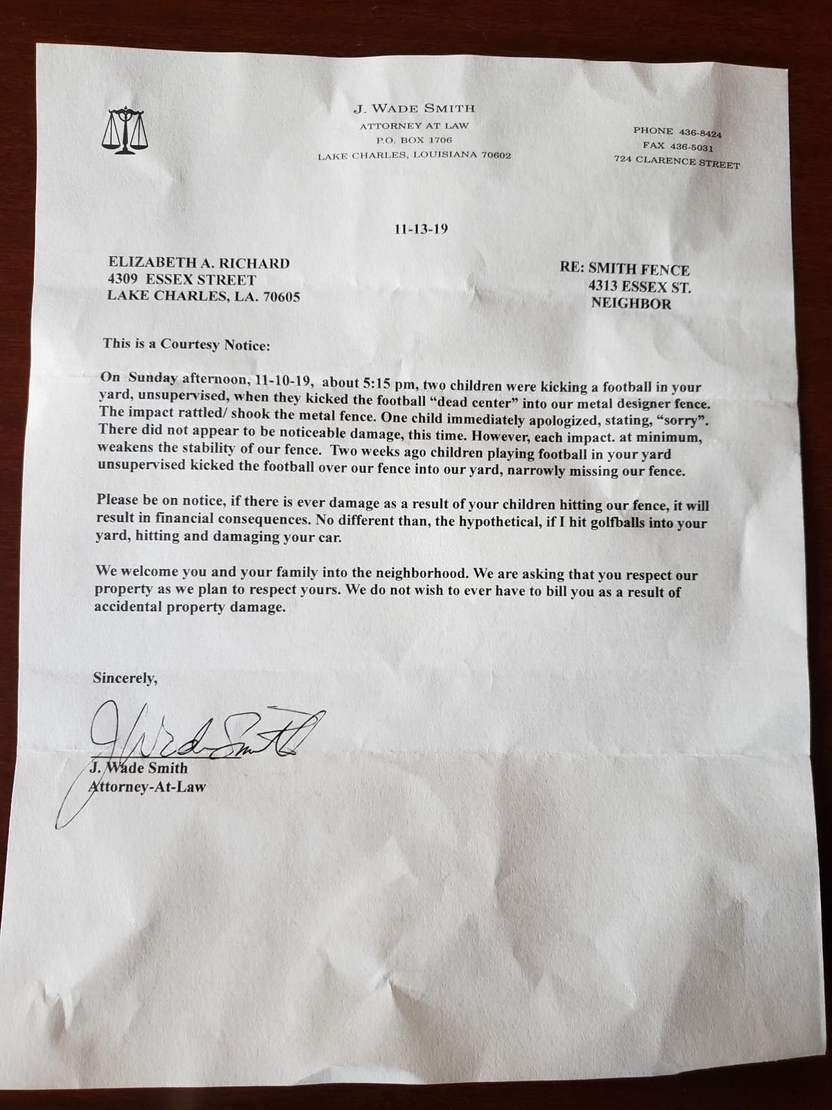 Lake Charles Attorney Sends Letter To New Neighbor