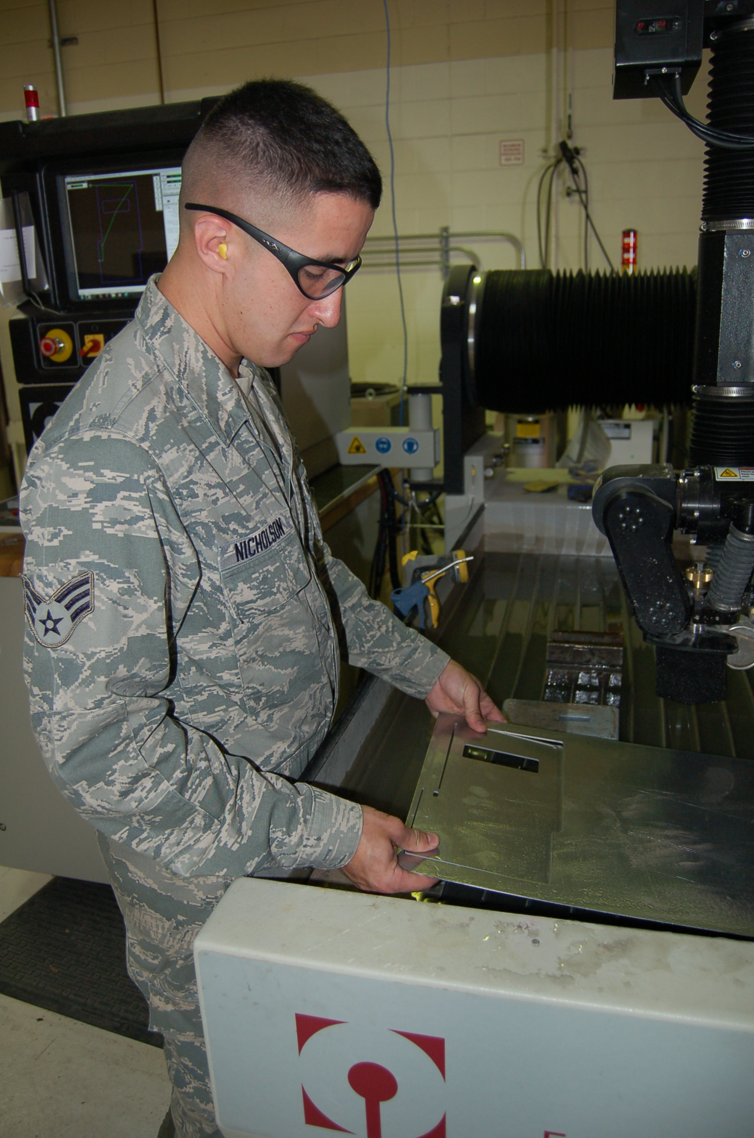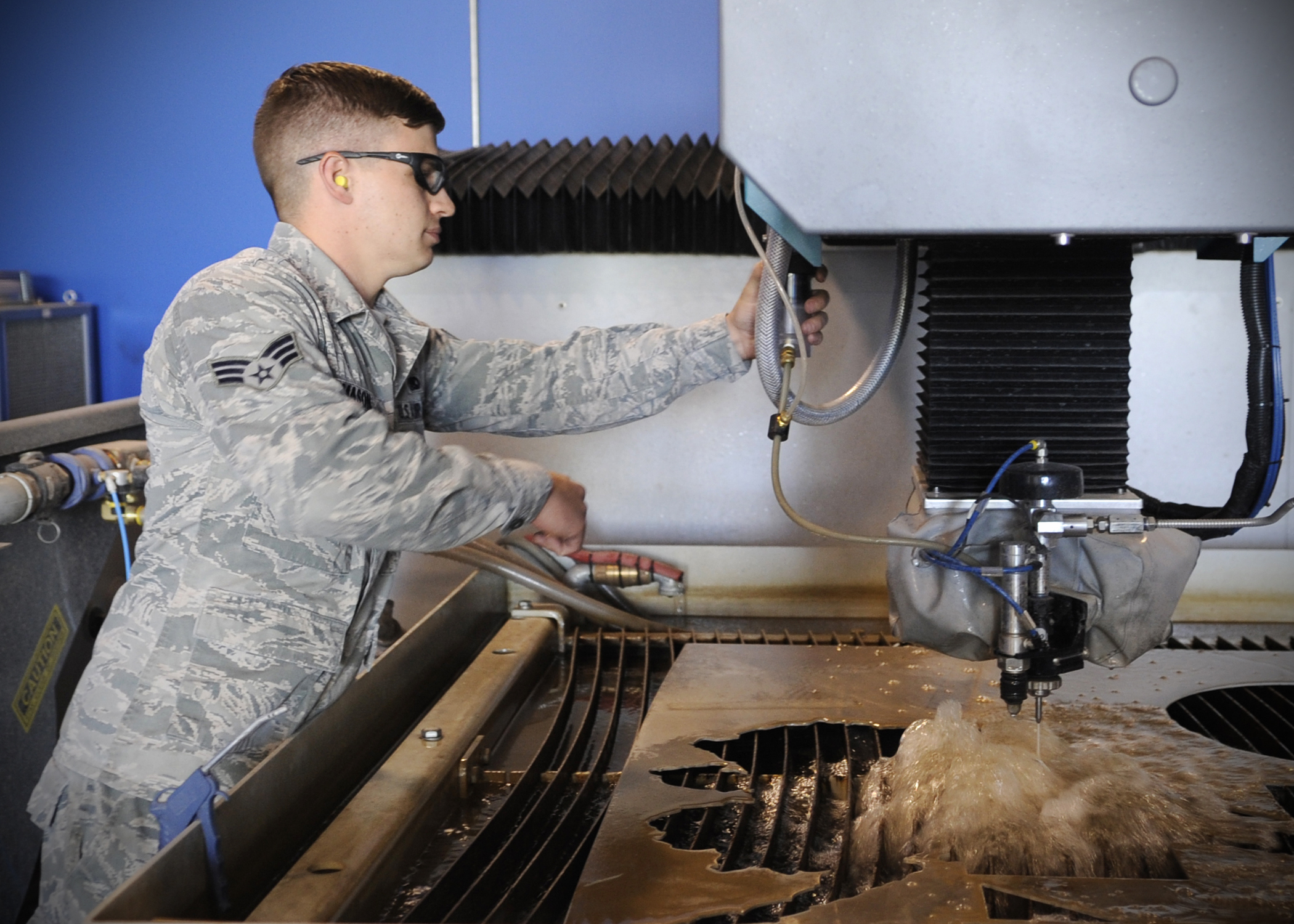 Hull Maintenance Technician Fireman Mionna Green Adjusts The Clearance Of The Cutting Head On The New Waterjet Fabrication System At Southeast Regional Maintenance Center Abrasive Waterjet Technologies Enable The Shipfitter Shop Here