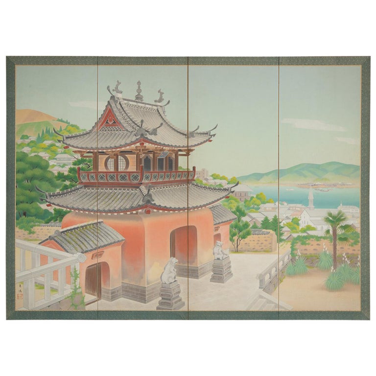 Japanese Four Panel Screen Okinawa Painting Of A Temple Scene For Sale At 1stdibs