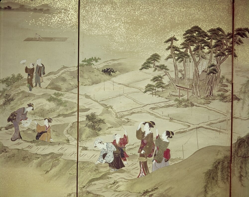 Image Of Japan Picnic C1600 Setting Out For A Picnic A Family Carries Food Hampers And A Sake Jug Rice Paddies On The Right Lead To A Shinto Shrine Paper Screen