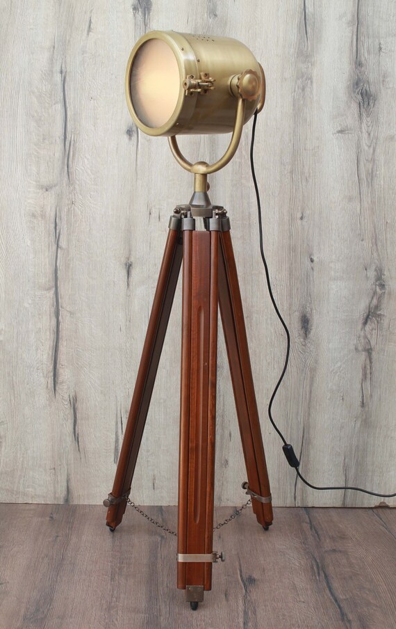 Tripod Floor Lamp Nautical Spotlight Vintage Studio Wooden Light Home Office New