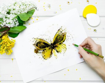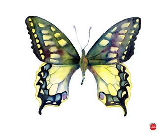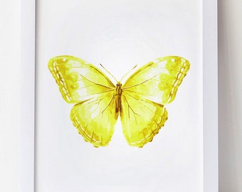 Butterfly Art Print Watercolor Painting Wall Art Butterfly Print Yellow Butterfly Ink Green Leaf Akwarele