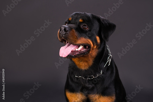 Portrait Of Adorable Rottweiler Dog Young Rottweiler Dog With Metal Chain On Neck Posing On Dark Background Studio Shot Buy This Stock Photo And Explore Similar Images At Adobe Stock