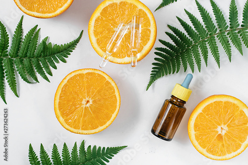 Citrus Essential Oil Vitamin C Serum With Fresh Juicy Orange Fruit And Leaf Fern On White Background Organic Spa Cosmetic With Herbal Ingredients Toning High Dose Vitamin C Synthetic For Skin