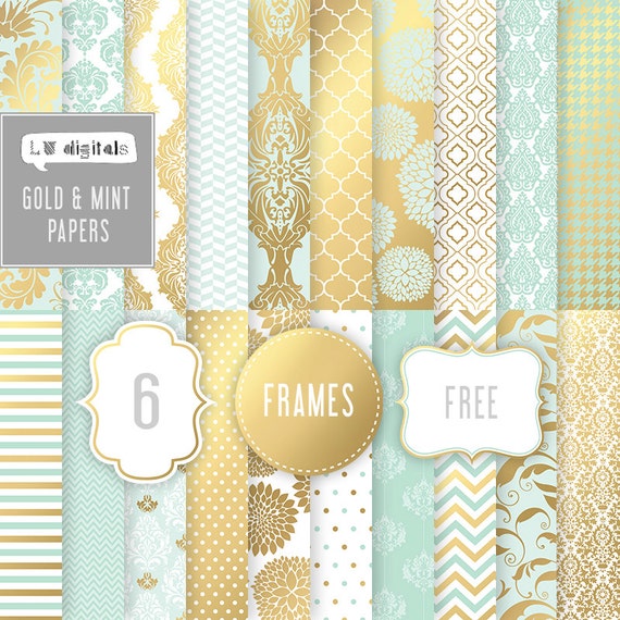 Mint And Gold Digital Paper Wedding Invitation Frames Damask Etsy