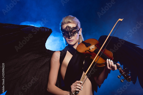 Beautiful Sexy Woman With Lace Mask And Black Angel Wings Playing Violin On Dark Blue Smoky Background Buy This Stock Photo And Explore Similar Images At Adobe Stock Adobe Stock