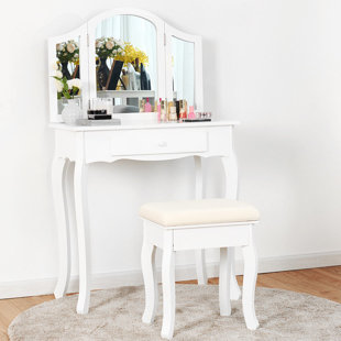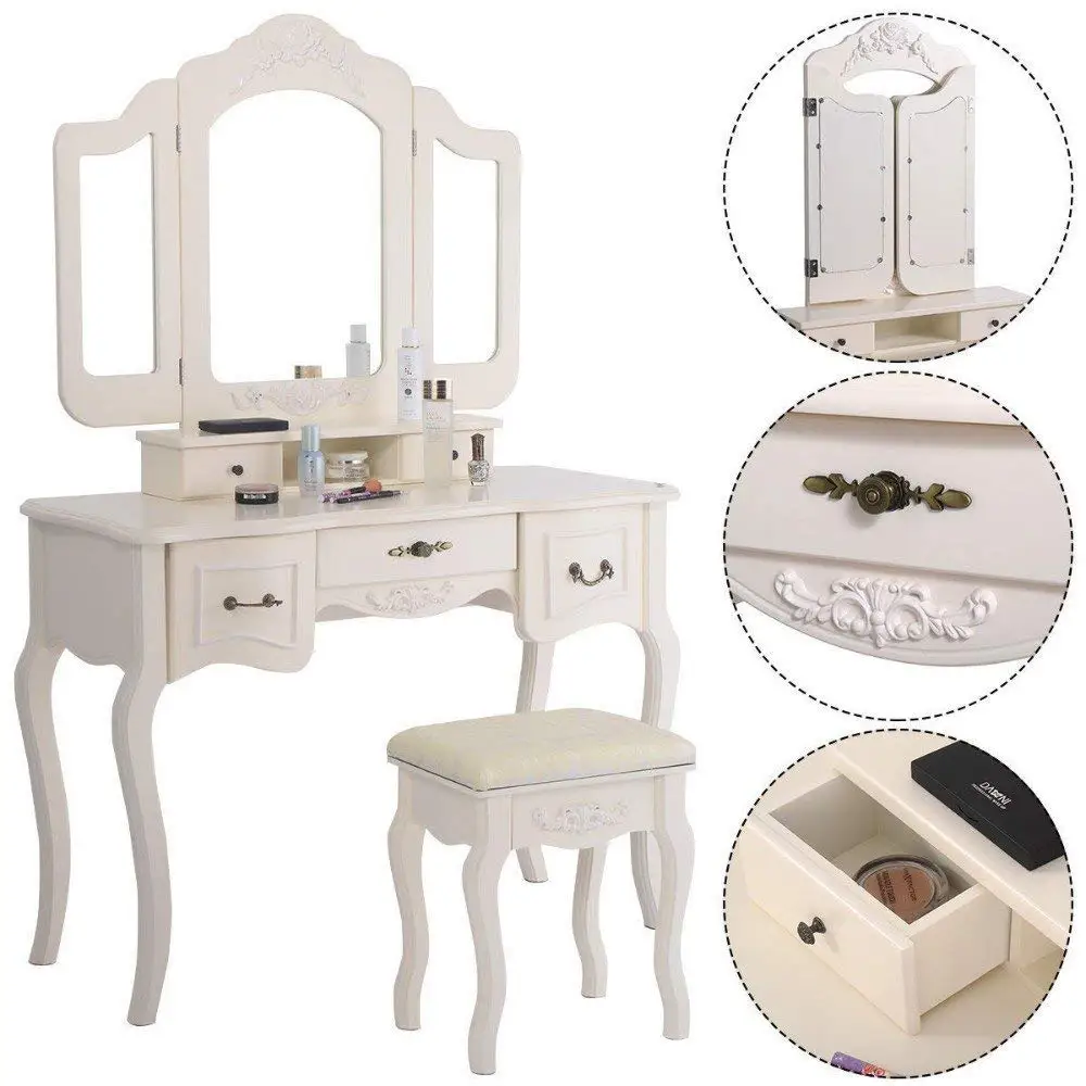 Tri Folding Vintage Vanity Makeup Dressing Table With5 Drawers Stool White Vanity Makeup