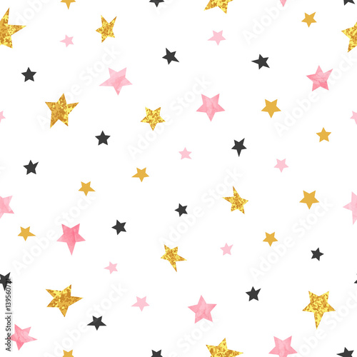 Stars Pattern Vector Seamless Background With Watercolor Pink And Glittering Golden Stars Poster Afanasia