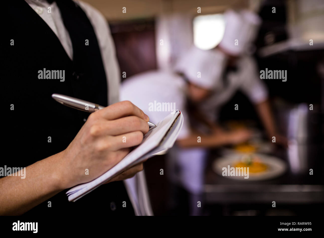 Female Waitress Noting An Order On Notepad In Kitchen Stock Photo Alamy