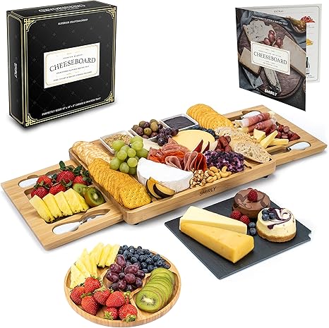 Amazon Com Smirly Cheese Board And Knife Set Charcuterie Board Organic Bamboo Cheese Platter With Accessories Drawer 4pc Cheese Knife Set And 3x Sauce Dish Dip Bowls Wedding Gifts Housewarming Gifts Cheese