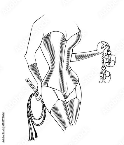 Decorative Drawing In Sketch Style With Sexy Inked Female Body Legs In Latex Stockings And Tight Corset Holding The Thong Handcuffs Vector Illustration Isolated Buy This Stock Vector And Explore Similar
