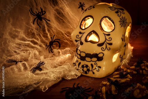 Skull On A Wooden Table Covered In Spider Webs And Spiders With A Candle Lighting The
