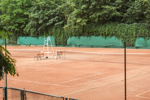 View Of Brown Tennis Court With Net Chairs And Trees Buy This Stock Photo And Explore Similar Images At Adobe Stock Adobe Stock