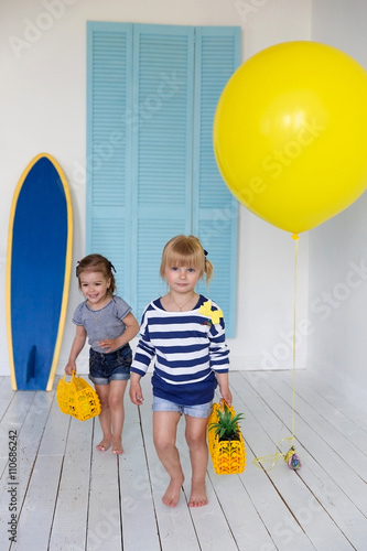 Little Girls Are Carrying Toy Bags Near Surfboard And Yellow Balloon Buy This Stock Photo And Explore Similar Images At Adobe Stock Adobe Stock