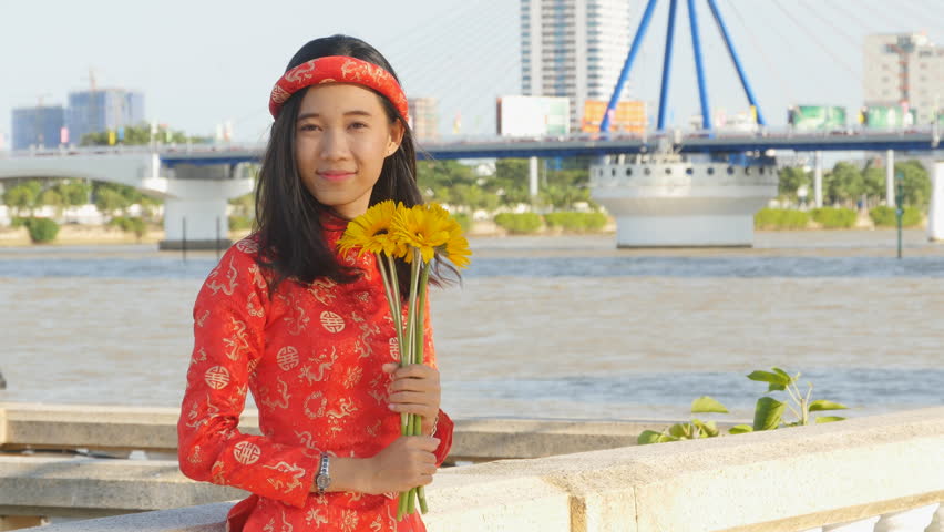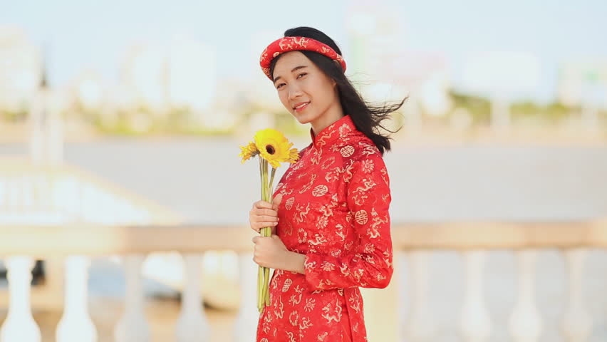 Beautiful Vietnamese Girl In Red Traditional Dress Ao Dai With Yellow Flowers Stock Footage Hd Video Clipcanvas