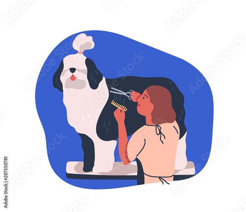 Grooming Service Flat Vector Illustration Dog Groomer Cutting Animal Fur With Scissors Girl Care For Pet Cartoon Character Smiling Dog Stylist At Work Animal Clinic Pet Salon Isolated Clipart Buy This