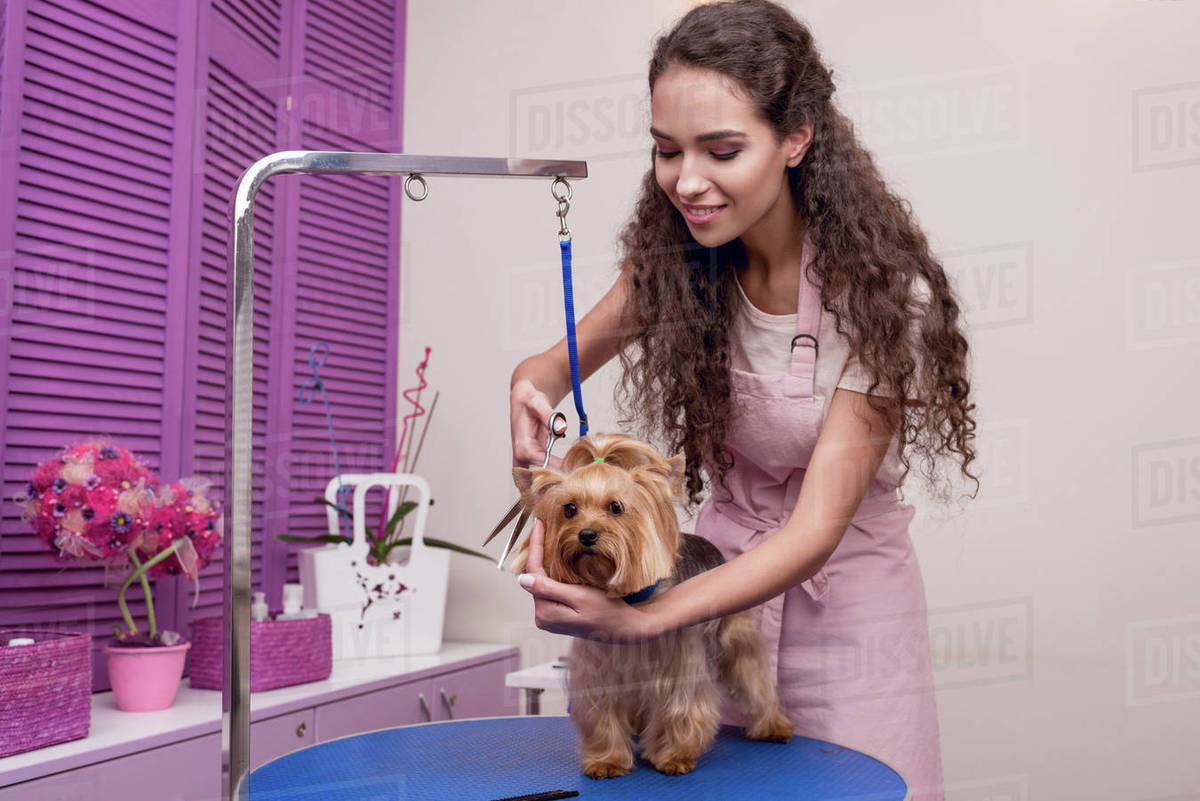 Smiling Young Professional Groomer Holding Scissors While Grooming Dog In Pet Salon Stock Photo Dissolve