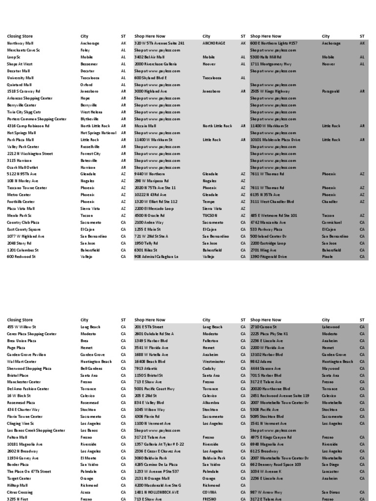 Payless Store Closing List