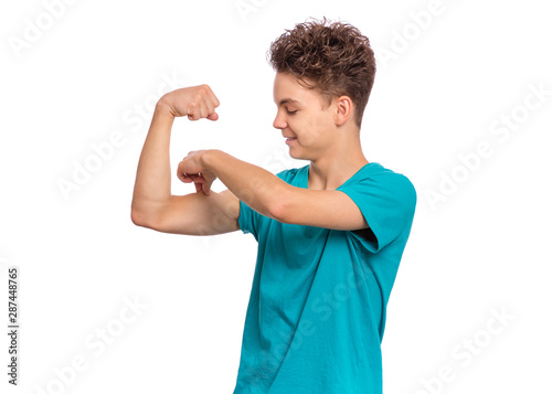 Portrait Of Funny Teen Boy Raised His Hands And Shows Biceps Isolated On White Background Handsome Teenage Young Boy Shows Biceps Happy Strong Child Flexing Biceps Buy This Stock Photo And
