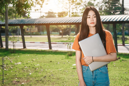 A Young Or Teen Asian Girl Student In University And Holding The Laptop Computer In Summer Holiday In The Park Buy This Stock Photo And Explore Similar Images At Adobe Stock