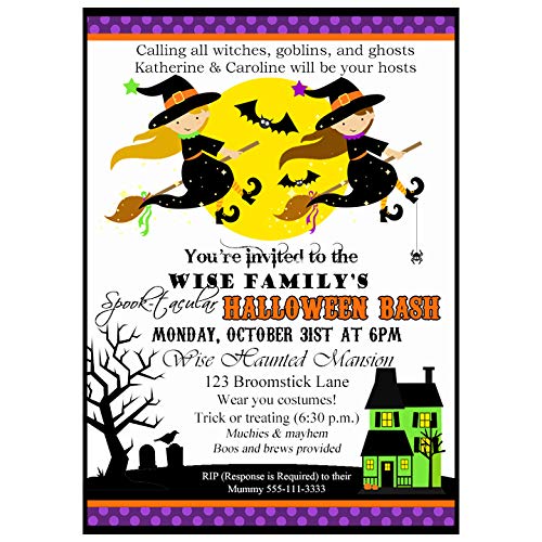 Halloween Party Invitation Witches Flying Broom Stick Sunshine Parties