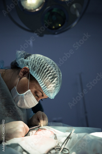 Female Veterinarian Stands Under Surgical Lights Does Cat Sterilization Surgery And Sews Up The Wound Vet Holding A Needle In His Hands Veterinary Surgery Operation Laparotomy Concept Buy This Stock Photo