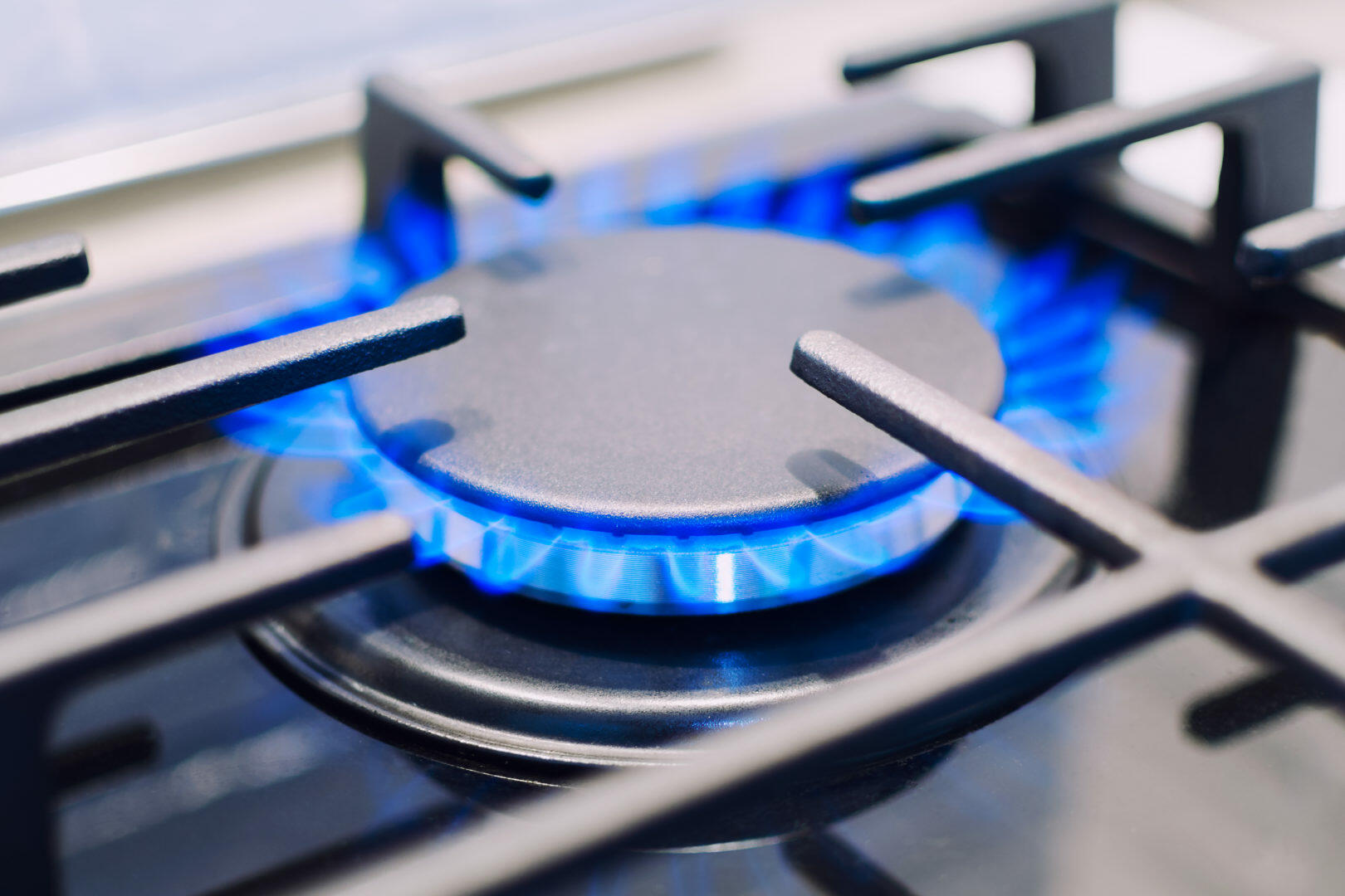 Gas Burner Burns With A Blue Flame On The Stove Under The Protective Grille Photo With Shallow Depth Of Focus Stock Photo C Lina Mo