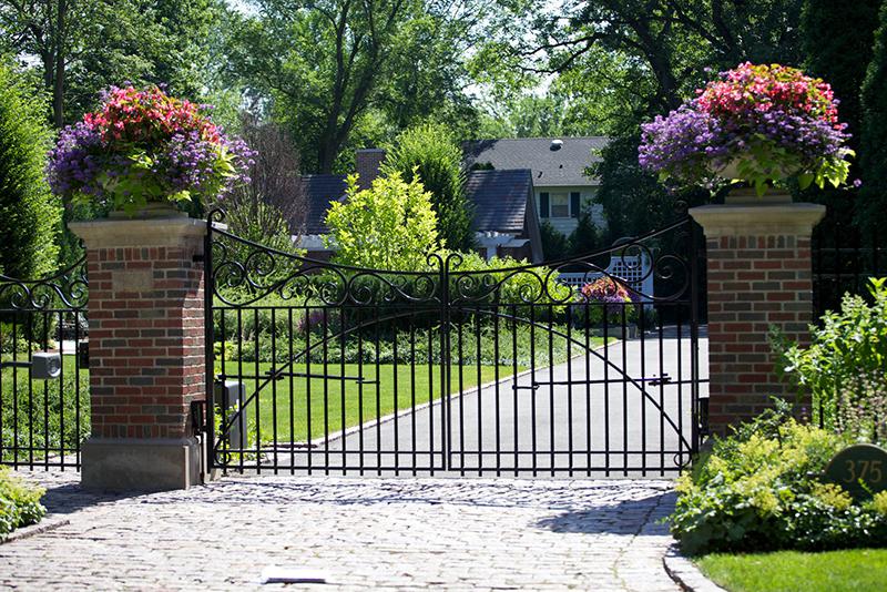 Tall Donovan Wrought Iron Gate Hung On Brick Pillars