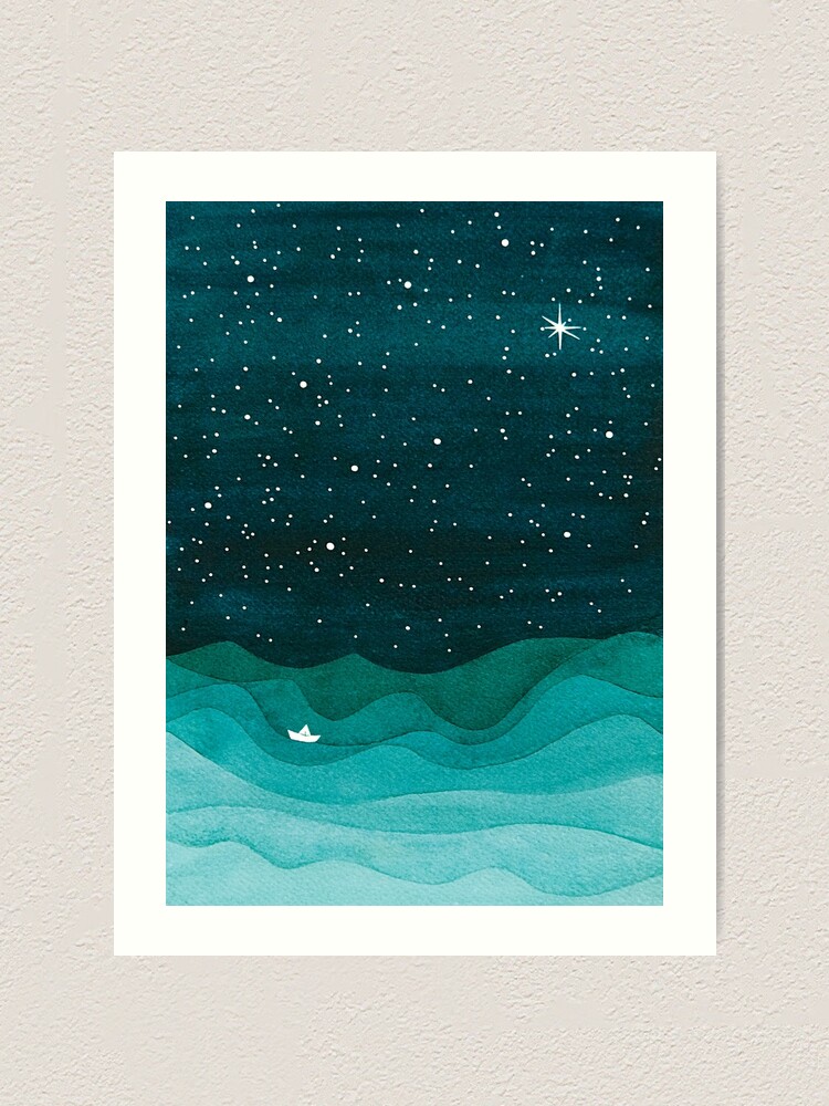 Starry Ocean Teal Sailboat Watercolor Sea Waves Night Art Print By Vapinx Redbubble