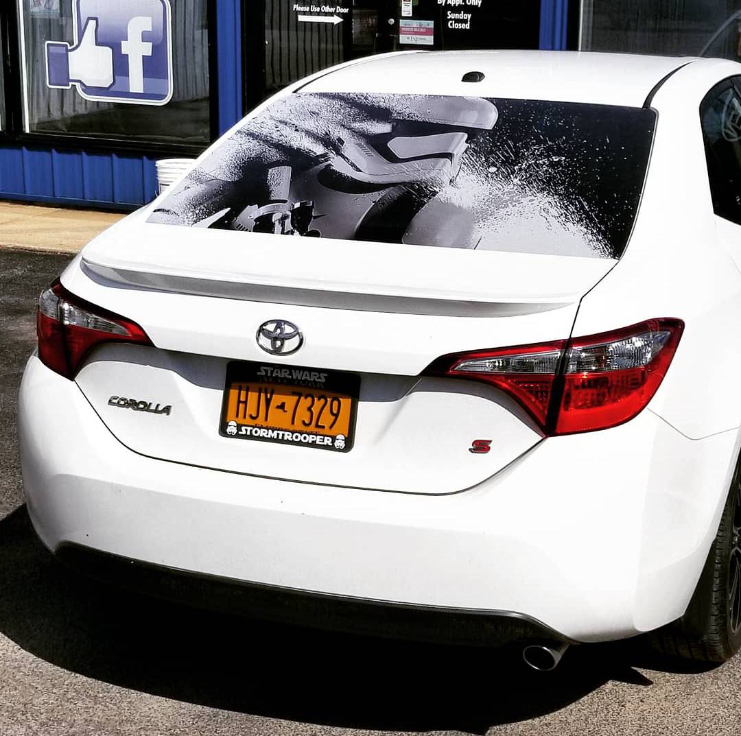 A M Graphics Inc Stormtrooper Perforated Window Film Wrap For This Starwars Fan Today Looking To Customize Your Ride Letushandleit Toyota Corolla Automotive Restyling Graphics Custom Car Decals