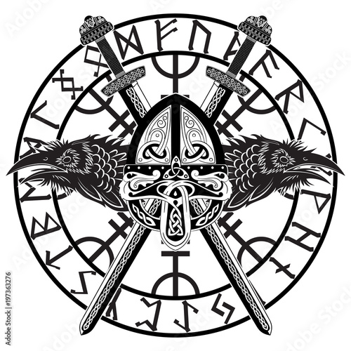 Viking Helmet Crossed Viking Sword In A Circle Of Scandinavian Runes And Two Raven Buy This Stock Vector And Explore Similar Vectors At Adobe Stock Adobe Stock