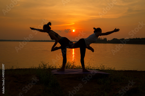Yoga Silhouette Two Woman Practicing Yoga Poses On Sunset Riverside Of Nature Buy This Stock Photo And Explore Similar Images At Adobe Stock Adobe Stock