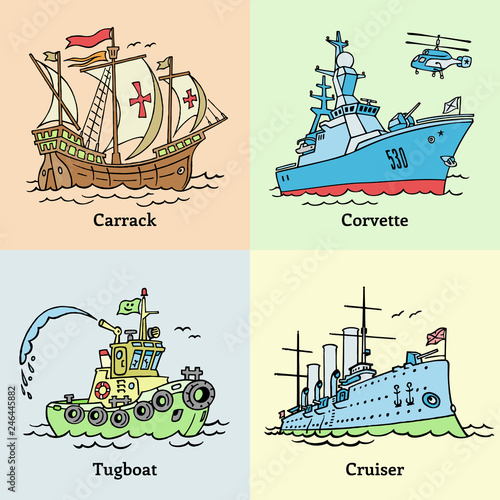 Vector Illustration Of Boats Coloring Book With Ships Carrack Tugboat Cruiser And Corvette Buy This Stock Vector And Explore Similar Vectors At Adobe Stock Adobe Stock