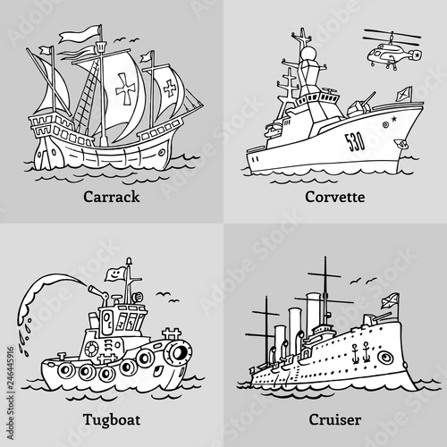 Vector Illustration Of Outline Boats Coloring Book With Ships Carrack Tugboat Cruiser And Corvette Buy This Stock Vector And Explore Similar Vectors At Adobe Stock Adobe Stock