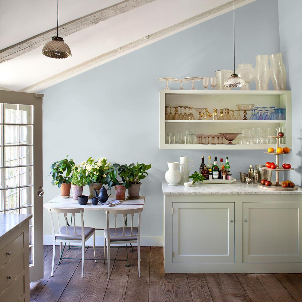 “I selected a soft blue-gray to subtly draw attention to the fabulous Tom Dixon pendants. See all Blue Paint Colors. Pair it with any wood and off-white trim.