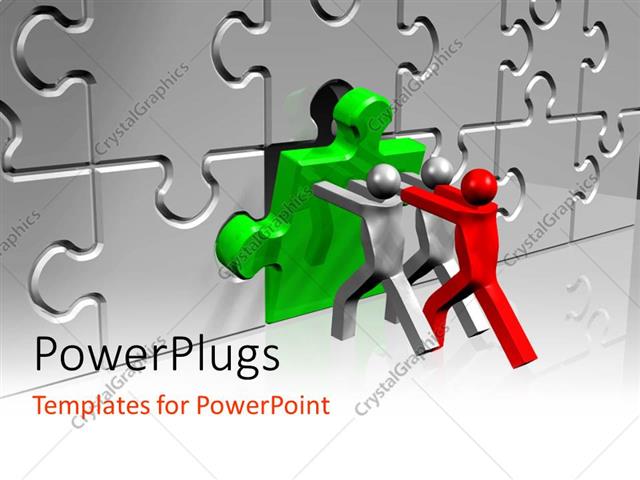 Powerpoint Template One Red And Two Silver Figures Pushing Green Puzzle Piece Into Place