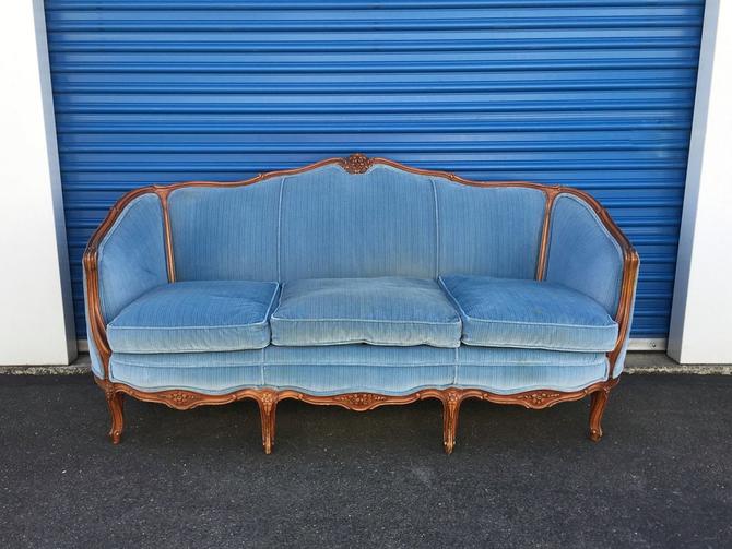 Vintage Antique Mid Century Blue Velvet Sofa Hollywood Regency French Provencial