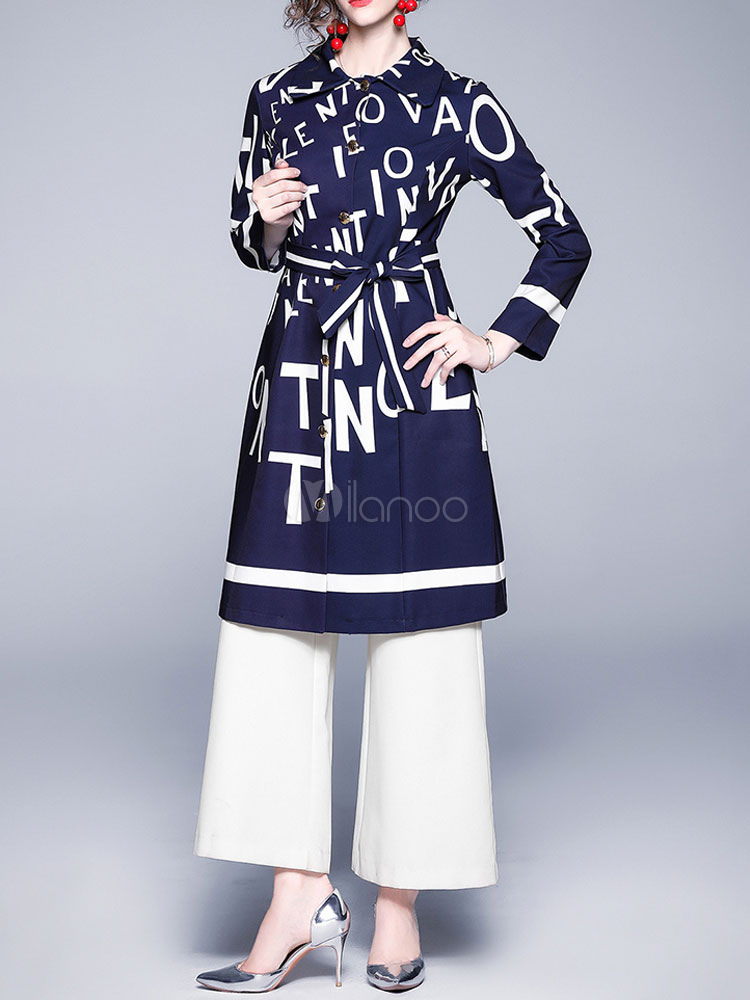 Outerwear For Woman Letters Print Turndown Collar Lace Up Classic Oversized Deep Blue Winter Coat Milanoo Com