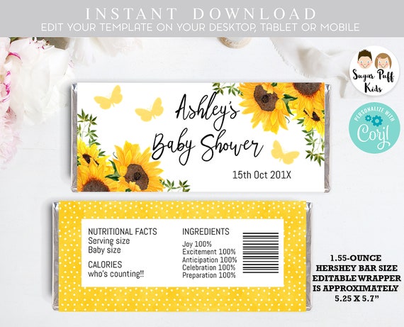Sunflowers Butterfly Kisses Baby Shower Candy Wrapper Printable Yellow Baby Shower Candy Bar Wrapper Sunflowers Chocolate Wrapper By Sugar Puff Kids Catch My Party